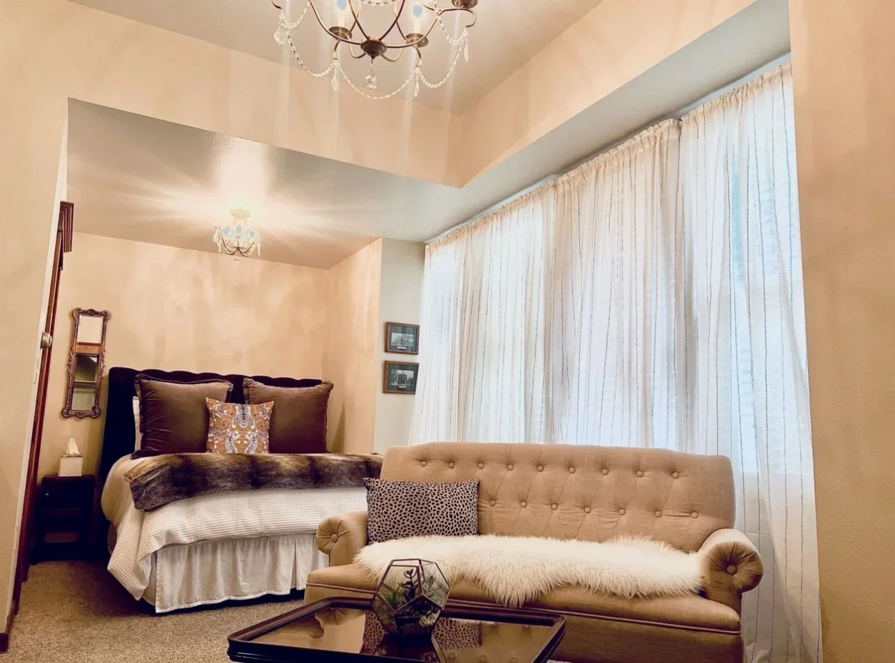 Room 1 is a spacious city view room on the 1st floor, featuring a kitchenette, sitting area, Smart TV, a private full bath, and individual climate control. The kitchenette has a mini refrigerator, microwave and Keurig coffee machine. All rooms have duvets and luxury linens.